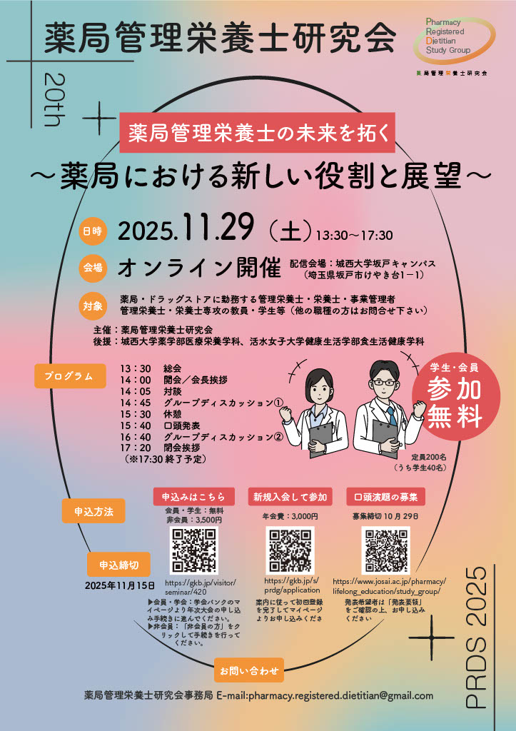 • 対象:薬局・ドラッグストアに勤務する管理栄養士・栄養士・事業管理者、管理栄養士・栄養士専攻の教員・学生等