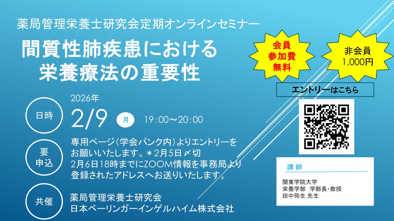 薬局管理栄養士研究会 定期オンラインセミナー<メーカーセミナー②間質性肺疾患における栄養療法の重要性>2/9(月)19:00〜